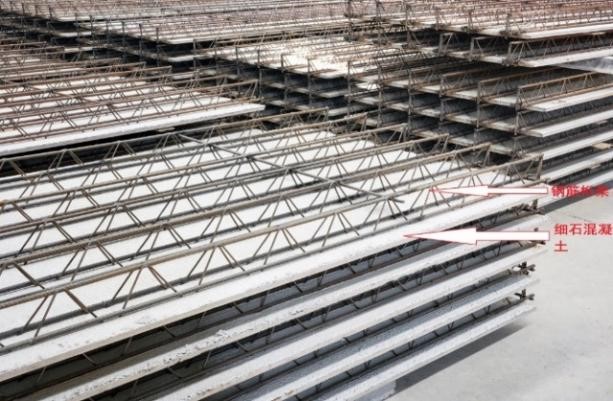 由钢筋桁架与细石混凝土底板通过工厂锚固组合成的预制板,通过现场浇筑叠合层混凝土而形成整体。标准板宽1200/600mm,最大单块长度7200mm;细石混凝土底板厚20mm,叠合后的总厚度为100-210mm;施工阶段底板作为模板,使用阶段底板与现浇混凝土共同受力。